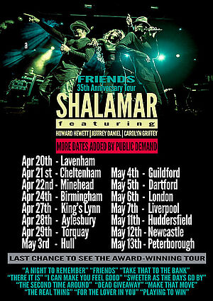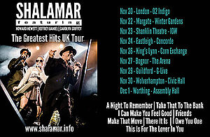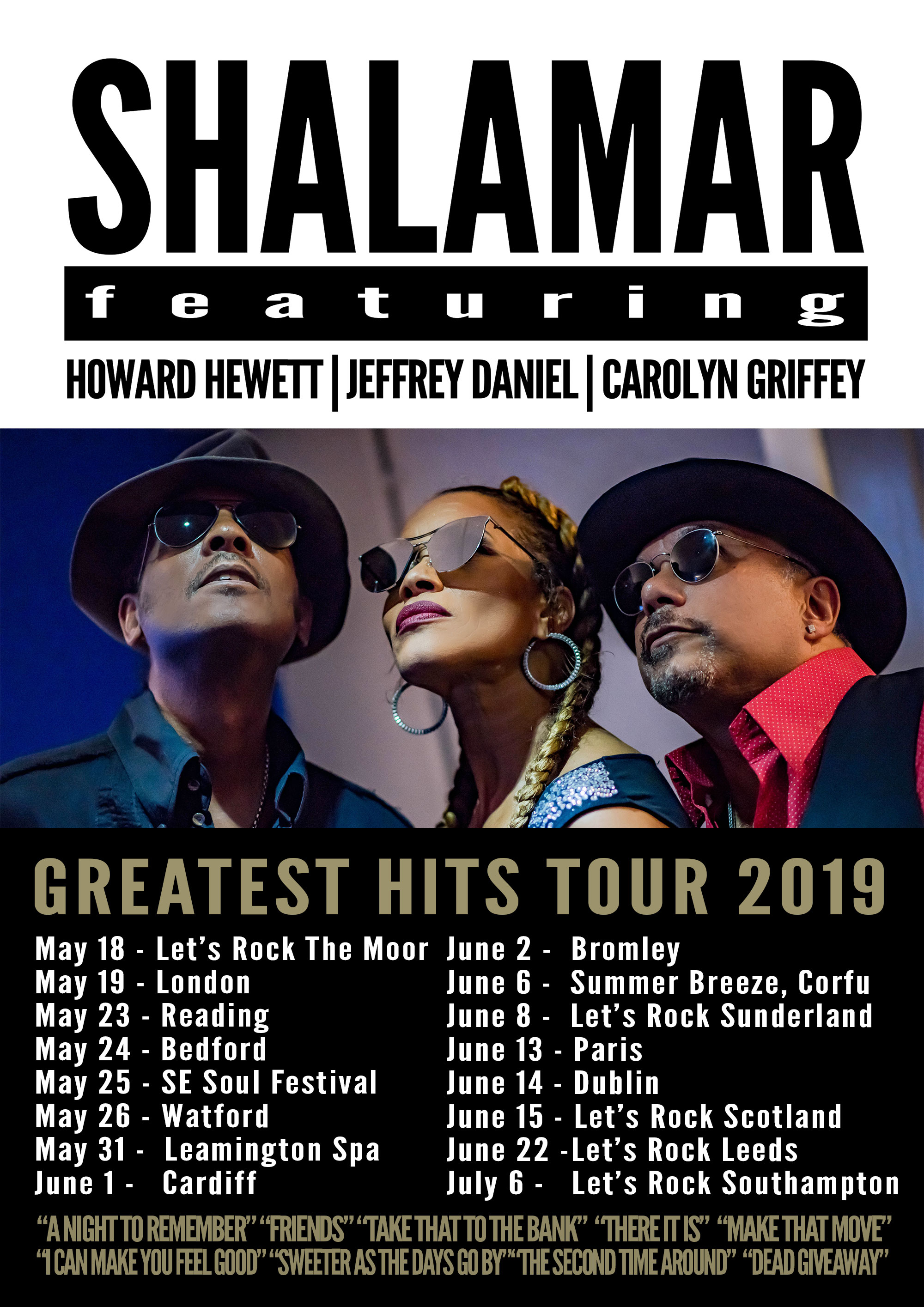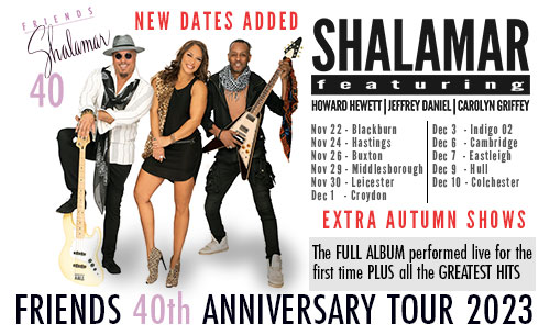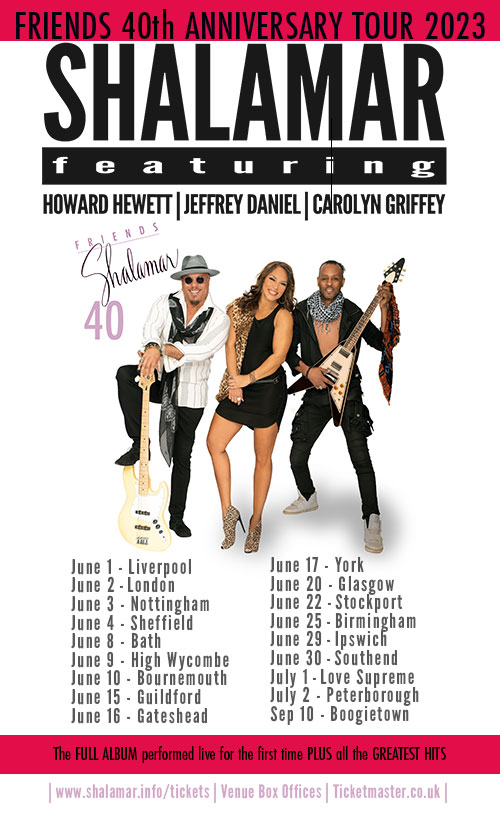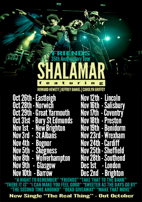 2025- Shalamar Live in Concert Buy Tickets from Venues - Click Here Current Events Wednesday June 4th – Utrecht - TivoliVredenburg Saturday June 7th – Maldon - Soultasia Festival Sunday June 22nd – Blenheim - Nocturne Festival Friday July 11th – Dreamland - Margate Summer Series Friday July 18th – Mallorca - Soul Town Festival Mallorca Saturday Sep 6th – Beckenham - Soul Town Festival Aug 9th – San Diego - Pachanga Casino Aug 22 - Virginia Beach - Funk Fest Beach Party Aug 28 - Washington DC - The Birchmere Aug 30 Chicago - Chicago Country Club 2024- Shalamar Live in Concert Thursday May 23rd – Amsterdam - Melkveg Friday May 31st – Stoke – Victoria Hall Saturday June 1st – Brighton – Brighton Centre Sunday June 2nd – Manchester – Bridgewater Hall Tuesday June 4th - Halifax – Victoria Theatre Thursday June 6th – Cardiff – New Theatre Friday June 7th - Derby - Arena Saturday June 8th – Bournemouth – Pavilion Theatre Sunday June 9th – London – Dominion Theatre Wednesday June 12th - Portsmouth – King’s Theatre Thurs June 13th St Albans – Alban Arena Friday June 14th – Birmingham – Symphony Hall Saturday June 15th – Bristol – Beacon Sunday June 16th – Southend - Cliffs Pavilion Thursday June 27th - Dartford – Orchard West Saturday June 29th – Edinburgh – Usher Hall Sun June 30 – Liverpool – M&S Bank Arena Saturday July 22 – Trinidad - More FM's 20th Anniversary Celebration & Music Festival Friday August 16th – Chicago IL - Horse Shoe Casino Hammond Ind. Saturday August 17th – Bethesda MD - Bethesda Jazz and Blues Club Saturday August 24th – Sacramento CA - Thunder Valley Casino Sacramento Thursday August 29th – Detroit MI - Sound Board at MotorCity Casino Hotel Saturday August 31st – Los Angeles CA - Sofi Stadium Live Nation Festival LA. Lineup may vary - please check venue website for up to date details. 2023 Shalamar - Live In Concert Sep 3 - Jersey Weekender Sep 10 - BoogieTown Festival Sep 17 - Radio 2 - In The Park Festival Sep 22 - Delicious Festival - Johannesburg Sep 22 - Soul Weekender Nov 22 - Blackburn - King Georges Hall Nov 24 - Hastings - Whiterock Theatre Nov 26 - Buxton - Opera House Nov 29 - Middlesborough - Town Hall Nov 30 - Leicester De Montfort Hall Dec 1 - Croydon - Fairfield Halls Dec 3 - London - Indigo at the O2 Dec 6 - Cambridge - Corn Exchange Dec 7 - Eastleigh - Concorde Club Dec 9 - Hull - City Hall June 1 - Liverpool - The Philharmonic Hall June 2 - London - The Palladium June 3 – Nottingham - Royal Concert Hall June 4 - Sheffield - City Hall June 8 - Bath - The Forum June 9 - High Wycombe - The Swan Theatre June 10 - Bournemouth - Pavilion June 15 - Guildford - GLive June 16 - Gateshead - The Sage June 17 - York - Barbican June 20 - Glasgow - Royal Concert Hall June 22 - Stockport - Plaza June 25 - Birmingham - Symphony Hall June 29 - Ipswich - Regent Theatre June 30 - Southend - Cliffs Pavilion July 1 - Love Supreme Festival July 2 - Peterborough - New Theatre Dec 10 - Colchester - Charter Hall 2022- Shalamar Live in Concert May 27 - Northampton - Royal & Derngate- May 29 - Liverpool - The Philharmonic Hall May 30 - Faros - Portugal Weekender June 1 - Manchester - The Bridgewater Hall June 2 - London - The Palladium June 3 - Cardiff - St Davids Hall June 4 - Eastleigh - The Concorder Club June 5 - Dartford - The Orchard Theatre June 7 – Nottingham - Royal Concert Hall June 8 - St Albans - The Alban Arena June 10 - Colchester - Charter Hall June 11 - Leeds - O2 Academy June 15 - The Jam House - Birmingham June 17 - Soultasia - Maldon June 18 - Croyden - Fairfield Hall June 11 - The O2 Academy - Leeds July 23 - Solihull Festival July 24 - Rewind Scotland July 31 - South Tyneside festival Aug 6 - Soultasia - Windsor 2021- Shalamar Live in Concert Aug 28 - Happy Days Festival Aug 29 - Blackburn - King Georges Hall Sep 3 - Boston - Gliderdrome Sep 4 - Soul Town Festival Sep 9 – Portsmouth - Guildhall Sep 10 Bath - The Forum Sep 11 – Orrell Live Sep 12 - The Cambridge Club - Cambridge Sep 14 – Hastings - The White Rock Theatre 2019 - Shalamar Live in Concert 2019 - Past DatesMarch 29th - Maputo May 18th - Let's Rock - The Moor May 19th - The Aldwych - London May 23rd - The Hexagon - Reading May 24th - The Corn Exchange Bedford May 25th - The South East Soul Festival - Southend May 26th - The Colloseum - Watford May 31st - The Assembly - Leamington Spa June 1st - The Tramshed - Cardiff June 2nd - The Churchill Theatre - Bromley June 6th - Festival - Summer Breeze June 8th - Let's Rock - The North East June 13th - Paris June 14th - Vicar Street - Dublin June 15th - Let's Rock - Scotland June 22nd - Let's Rock - Leeds July 6th - Let's Rock - Southampton