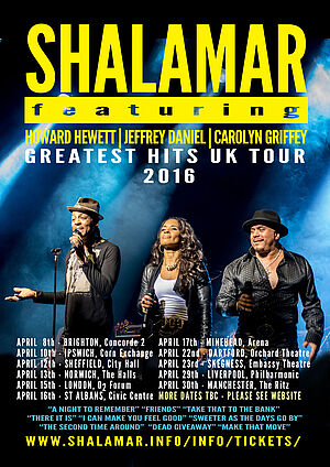 2018 - Shalamar Live in Concert 2018 November 24 - O2 Indigo - London November 27th - The Ritz - Manchester November 28th - The Jam House - Birmingham 2018 - Shalamar Live in Concert Past Dates April 20th - Lavenham - Lavenham Church April 21st - Cheltenham -Town Hall April 22nd - Minehead - The Arena April 24th - Birmingham - The New Alexandra Theatre April 27th - Kings Lynn - Corn Exchange April 28th - Aylesbury - Waterside Theatre April 29th - Torquay - Princess Theatre May 3rd - Hull City Hall May 4th - Guildford - G Live May 5th - Dartford - Orchard Theatre May 6th - London - The Palladium May 7th - Liverpool - The Philharmonic Hall May 11th - Huddersfield - Town Hall May 12th - Newcastle - City Hall May 13th - Peterborough - The Broadway Theatre August 12th - Isle of Wight - Jack Up The 80's (Festival) August 18th - Henley - Rewind South (Festival) 2017 - Shalamar Live in Concert August 9th - Detroit - Chene Park September 30th - Manchester - Radio 2 50th Birthday Party October 26 - Eastleigh, Concorde October 28 - Norwich - Epic Studios October 29 - Great Yarmouth October 31 - Bury St Edmunds - The Apex Nov 1 - New Brighton - Flora Pavilion Nov 3 - St Albans - Alban Arena Nov 4 - Bognor - Center Stage Nov 5 - Skegness - Centre Stage Nov 8 - Wolverhampton - Robin 2 Nov 9 - Glasgow - Pavilion Theatre Nov 10 - Barrow-In-Furness - The Forum Nov 12 - Lincoln - The Engine Shed Nov 16 - Salisbury - City Hall Nov 17 - Coventry - Copper Rooms Nov 18 - Preston - Guild Hall Nov 19 - Benidorm - Benidorm Palace Nov 23 - Wrexham - William Aston Hall Nov 24 - Cardiff - The Tramshed Nov 23 - Sheffield - The Foundry Nov 28 - Southend - Cliffs Pavilion Dec 1 - London - The Clapham Grand Dec 2 - Brighton - Concorde 2 2017 - Shalamar Live in Concert - 2017 Past Shows April 20 - Birmingham, The Jam House April 21 - Durham - The Lobster Ball (Charity fundraiser) April 22 - London - The Clapham Grand April 25 - Leicester - O2 Academy April 26 - Bournemouth - Canvas April 28 - Liverpool - The Olympia April 29 - Manchester - The Academy April 30 - Bristol - SWX May 2 - Peterborough - The Cresset (More dates coming soon .... watch this space.) Join the Shalamar mailing list to keep up to date information on new concert announcements. 2016 - Shalamar Live in Concert - Past Dates April 8th - Brighton - Concorde 2 April 10th - Ipswich - Corn Exchange April 12th - Sheffield - City Hall April 13th - Norwich - The Halls April 15th - London, The Forum. April 16th - St Albans, Civic Centre April 17th - Minehead- Arena April 22nd - Dartford, Orchard Theatre April 23rd - Skegness, Embassy Theatre April 24th - Cambridge, The Junction April 29th - Liverpool Philharmonic April 30th - Manchester - The Ritz June 1st - Bournemouth - Canvas June 2nd - Bournemouth - Canvas June 4th - Let's Rock Bristol. June 5th - Amsterdam - The North Sea Jazz Club Nov 20 - London - indigo at The O2 Nov 22 - Margate - Margate Winter Gardens Nov 23 - Isle of Wight - Shanklin Theatre Nov 24 - Eastleigh - The Concorde Club Nov 26 - King's Lynn - King's Lynn Corn Exchange Nov 27 - Bognor Regis - The Arena Nov 29 - Guildford - G Live, Guildford Nov 30- Wolverhampton - Wolverhampton Civic Hall Dec 1 - Worthing- The Assembly Hall |